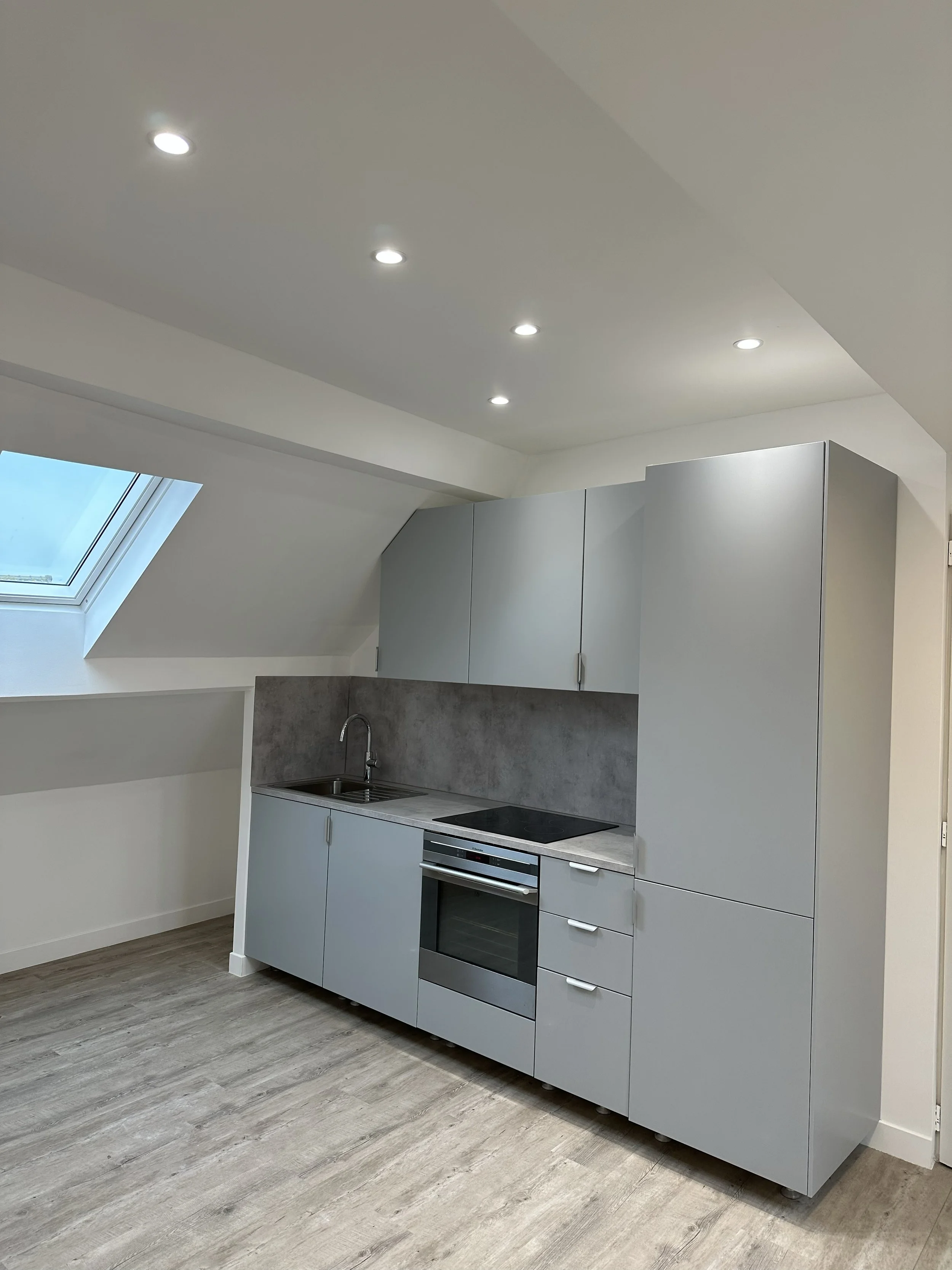 Création d'une nouvelle cuisine dans son intégralité. Plomberie, électricité, pose de carrelage, peinture et pose des meubles de cuisine